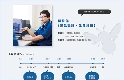 「身近で活躍する○○(製品名)」などのコンテンツで、分かりにくい自社製品や自社の特徴を、求職者の理解度に寄り添って発信できます。