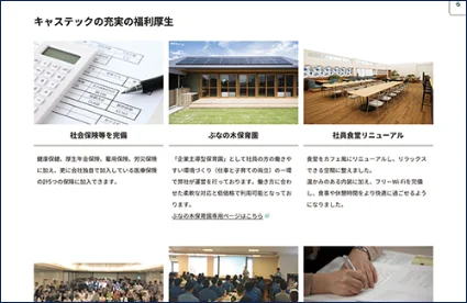 制度やサポート体制を分かりやすく紹介し、働きやすさや安心感を伝えるページです。他社との差別化や、応募の後押しに効果があります。